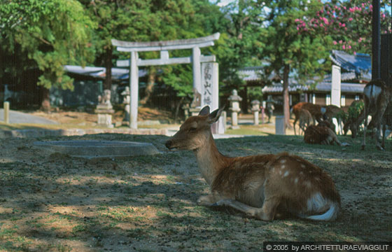 Passeggiando nel parco incontriamo molti cervi considerati, prima dell'avvento del Buddhismo, "messaggeri degli dei". Sullo sfondo si intravede un torii, la porta del tempio scintoista formata da due pilastri sormontati da due sbarre orizzontali poste trasversalmente, di cui quella superiore รจ in genere ricurva. Generalmente i torii sono dipinti di colore rosso vermiglio come molti santuari shinto.