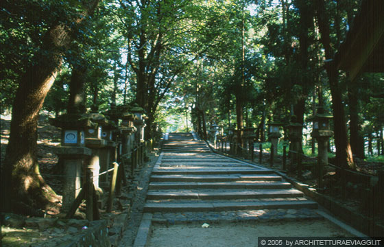 Seguiamo l'itinerario a piedi attraverso il Nara-koen consigliato dalla Lonely Planet e dalle varie mappe della città per raggiungere il famoso santuario Kasuga. Scendiamo due rampe di scale, attraversiamo un ponticello e ci ritroviamo in un sentiero nel bosco costeggiato da lanterne in peitra.