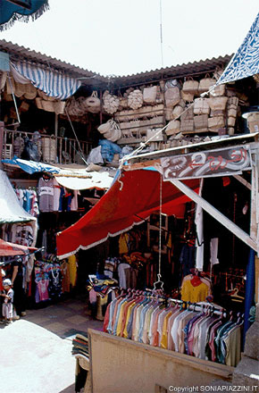punto focale del souq e i negozi sono raggruppati intorno ad essa secondo una rigida gerarchia: più vicini alla moschea sono i venditori di candele, incenso e oggetti per il culto, poi ci sono i librai, i venditori di oggetti di cuoio a cui seguono i banchi di stoffe e indumenti che appartengono ai mercanti più ricchi. Successivamente si incontrano i venditori di mobili, di casalinghi, di utensili e di merci comuni nei pressi delle mura della città. Qui ci sono i venditori di ferramenta e gli artigiani utili alle carovane quali sellai, venditori di corda, e tele e di tutto quanto può servire per un viaggio. Di solito fuori delle mura sono ubicati i laboratori di ceramica e le concerie per gli odori e il fumo che emanano.
